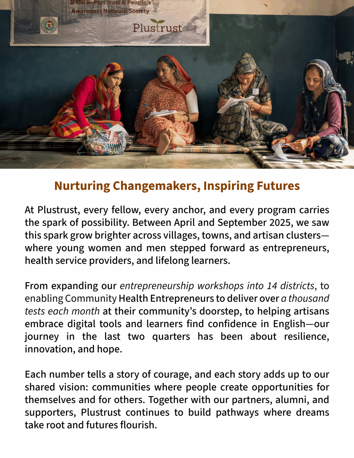 We address the persistent gender gap in entrepreneurship and innovation in rural communities in India that create major barriers to women’s aspirations and personal ambitions. Plustrust is therefore working with rural women changemakers by providing micro-incubation support through The Rural Women Edupreneur (RWE), Community Health Entrepreneur (CHE), Return to Roots ( R2R) and Changemaker Fellowship programmes. We identify and encourage those with entrepreneurial mindsets in piloting their entrepreneurial ventures in Education, Healthcare, and Livelihood to improve basic services in their community.
