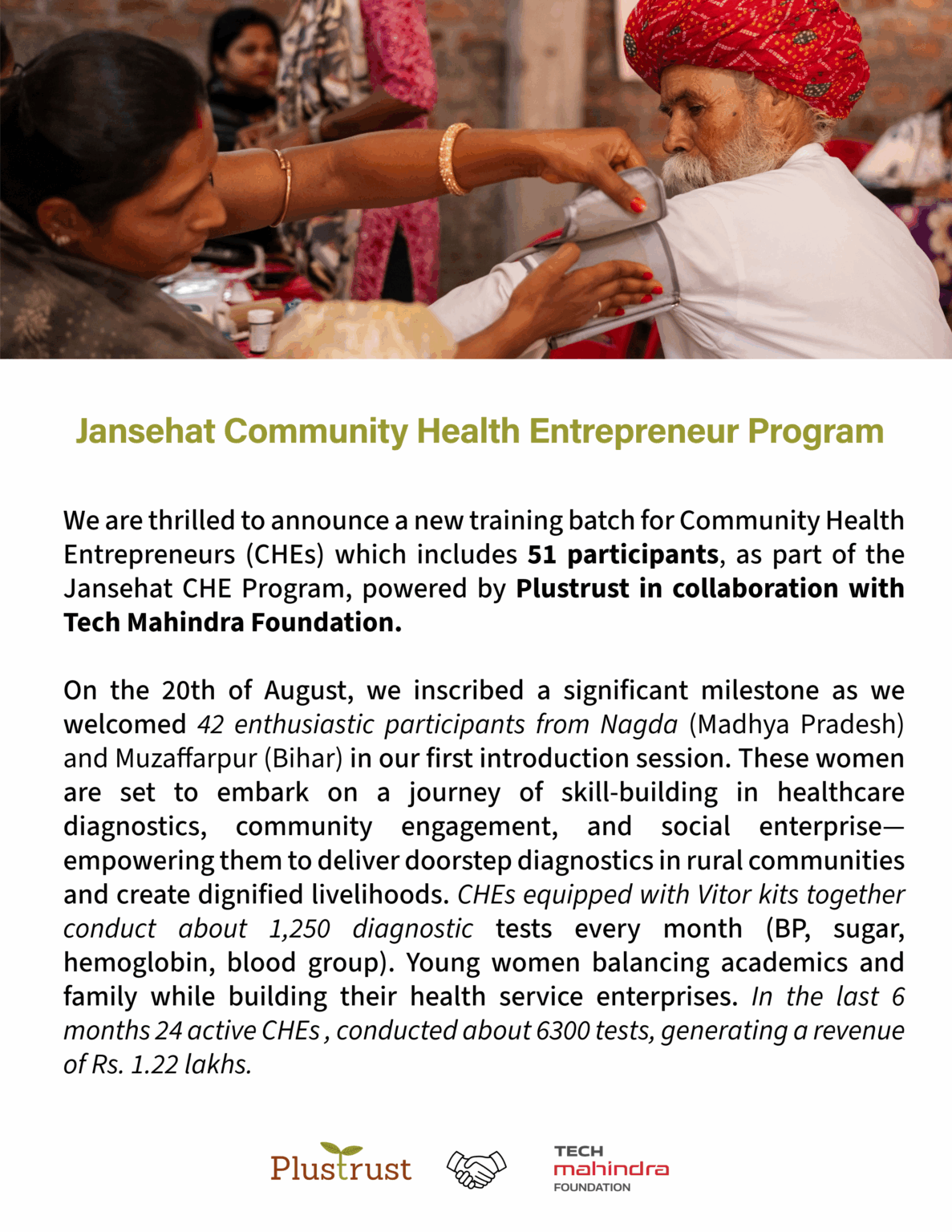 67 women emerged as Community Health Entrepreneur(CHE) and got equipped with skills to perform diagnostic testing. They reached out to about more than 25,000 people in their communities through healthcamps and community awareness sessions, done more than 7,000 diagnostic tests, and made an average earning of 1500-1800 per month working part time.